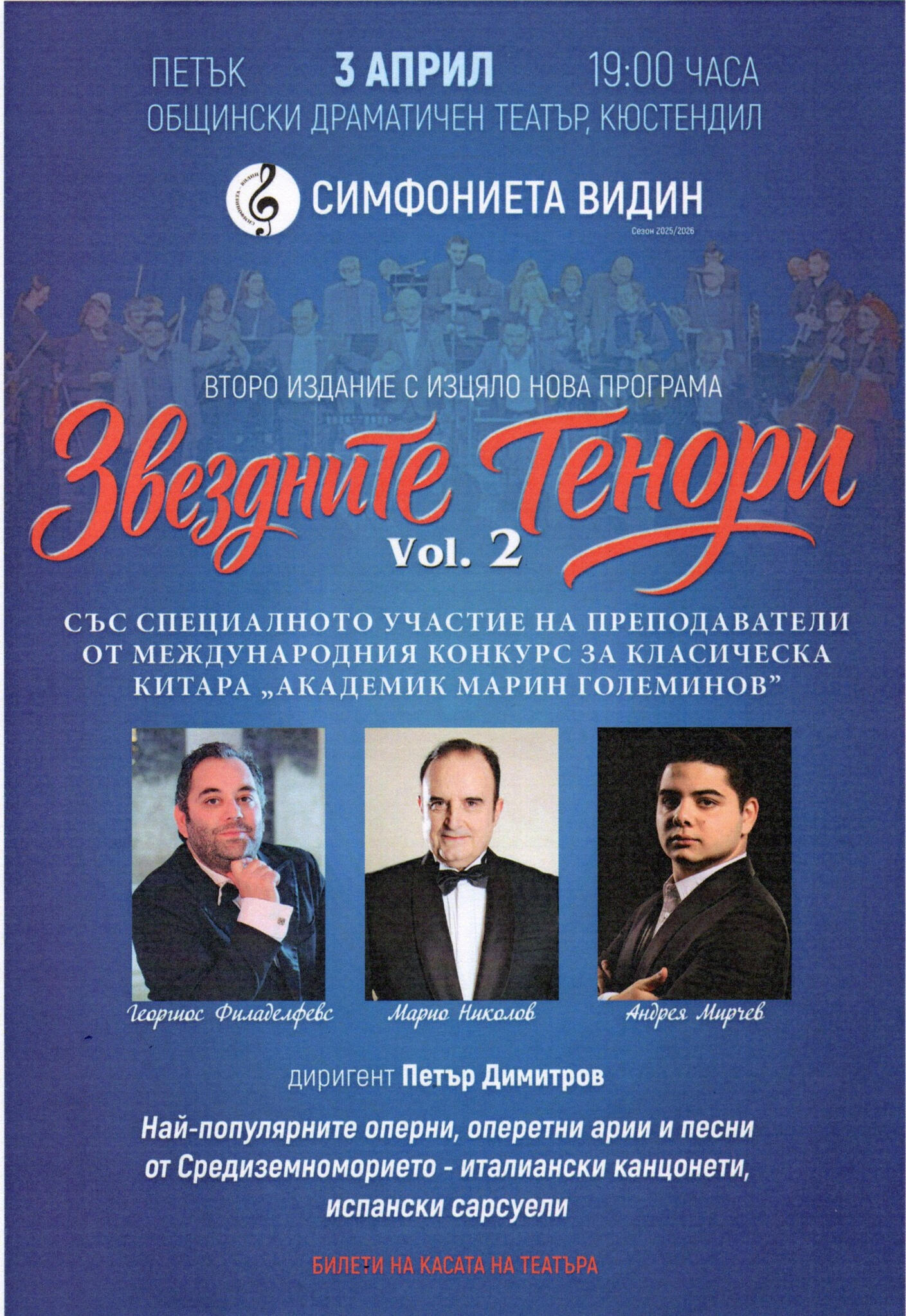 под диригентската палка на маестро Петър Димитров, представят второто издание с изцяло нова програма „THE STAR TENORS“ Vol. 2 за своите многобройни почитатели.