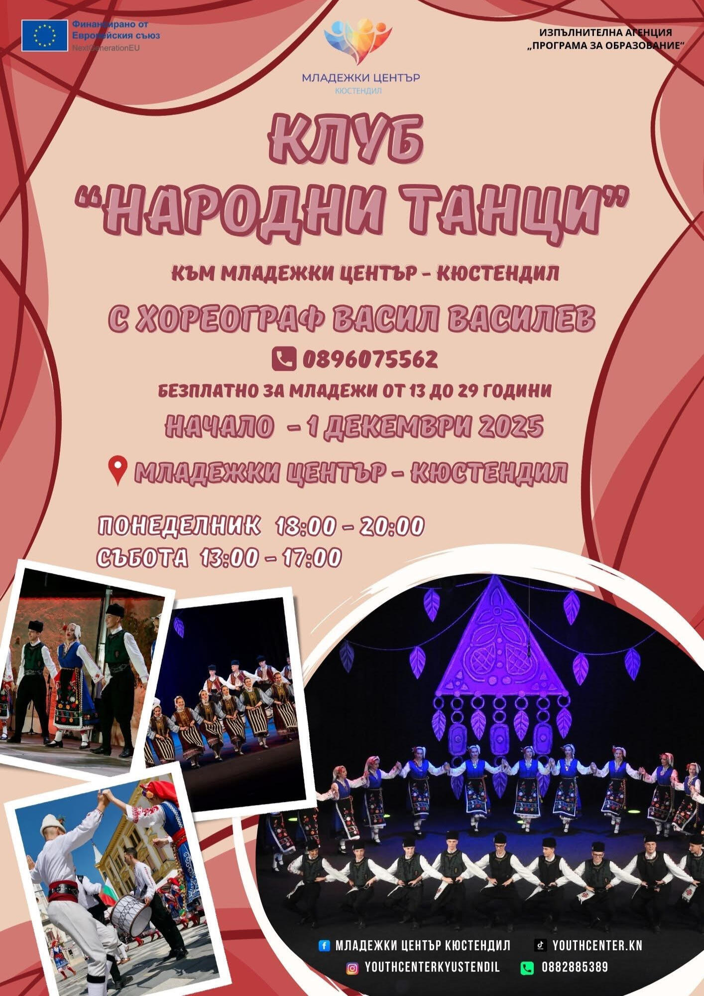 Заповядайте в клуба по народни танци към Младежкия център – място, където с музика, движение и настроение ще откриете красотата на българските традиции и ще създадете нови приятелства.